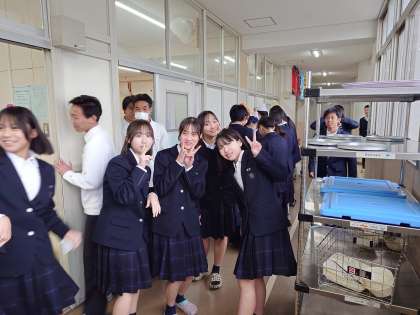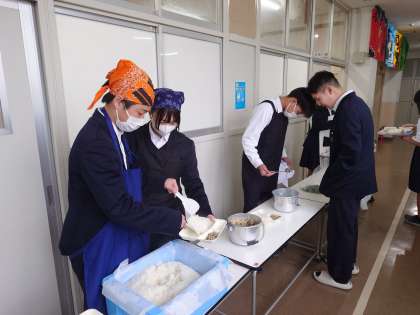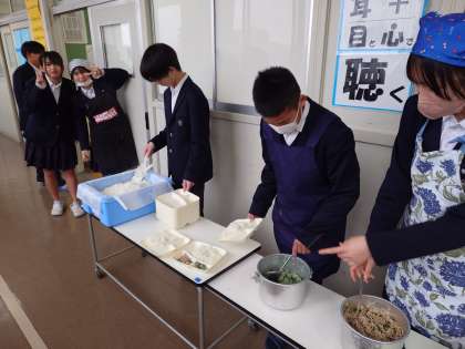 午前の授業が終わり、2年生の皆さんが給食の準備を行っています。今日のメニューは「豚の野菜炒め・鶏の五目汁・ヨモギ団子」です。ヨモギ団子は春を代表する和菓子の1つ。3月3日の桃の節句でもいただくことがありますね。きな粉をかけて独特の風味と食感を楽しみましょう。