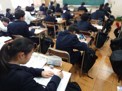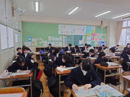 1年生理科の授業で「堆積岩」について学習します。ものが押し固められてできたのが堆積岩。土でできた堆積岩は、粒の大きさによって「れき岩・砂岩・泥岩」の3種類あるそうです。サンゴなどの生き物が固まったものは「石灰岩」と呼び、白っぽい色をしています。他にどんな堆積岩があるか調べてみましょう。