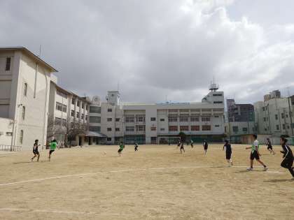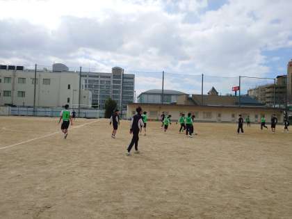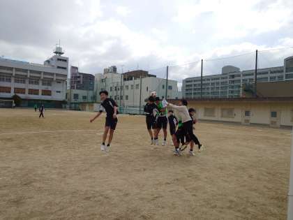 運動場で3年生男子の皆さんがサッカーの試合を行っています。ゴールキーパーには3年の先生が入り、一緒にプレーを楽しみます。中学校での体育の授業も今日が最後。みんなでラストゲームを満喫しています。