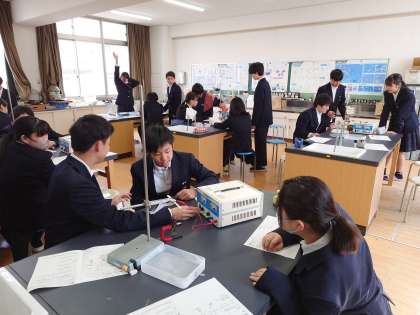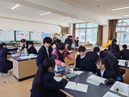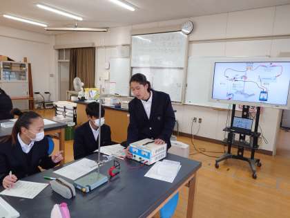 2年生の皆さんが理科室で何やら実験中。電流が決まった方向で磁界に近づくと、電磁力という力が起こります。「フレミングの左手の法則」と呼ばれる現象を実際に確かめてみるとのこと。U字磁石の中に入れたコイルに電流を流すと、コイルが一定の方向に動きます。皆さん、不思議な現象にびっくりしています。
