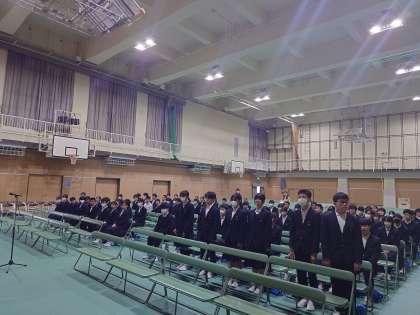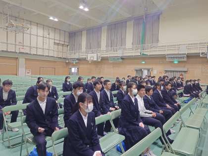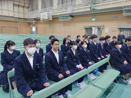 卒業式の練習が始まりました。3年生の皆さんが本番と同じ座席に座って、式の流れを教わります。司会の先生のアナウンスで、一斉に立ったり座ったりの動きがあります。先生の言葉に注目しましょう。