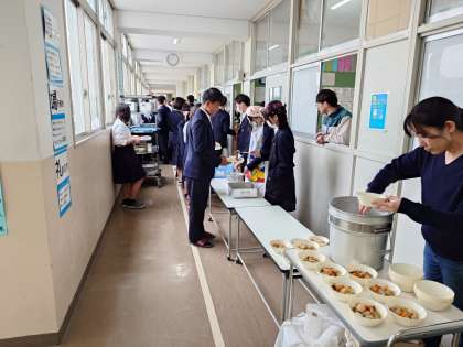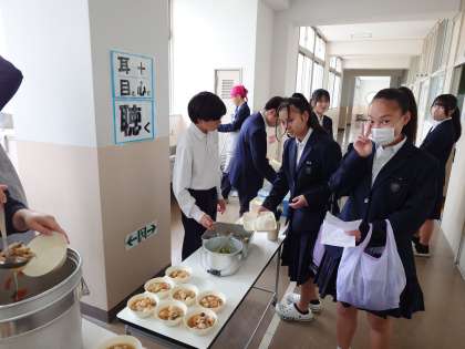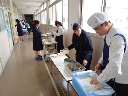 午前の授業が終わり、2年生の皆さんが給食の準備を行っています。今日は「サゴシのおろし醤油焼き・里芋と野菜の煮物・菜の花のおひたし」の和風メニュー。サゴシは鰆(サワラ)の小さいもので、今の時期が旬だそうです。菜の花と合わせて「春」の食べ物をいただきましょうが。