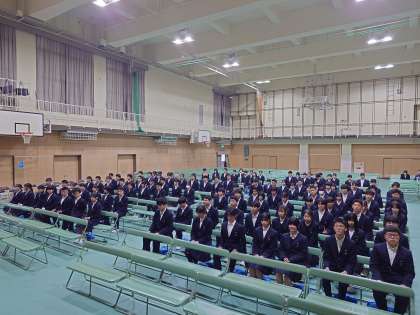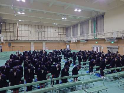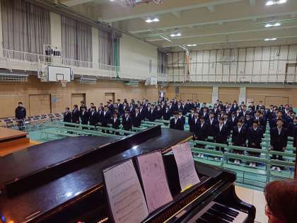 予行演習は本番と同じ流れで進みます。国歌・大阪市歌斉唱に続いて、桃中校歌を歌います。この体育館で校歌を斉唱するのも最後になりましたね。