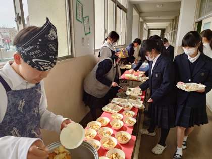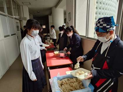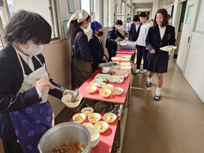 お昼休みのチャイムが鳴り、1年生の教室前で給食の準備が始まりました。今日のメニューは「関東煮・キュウリの梅風味和え・とら豆の煮物」です。竹輪やジャガイモ、厚揚げ・うずら卵などの具材をコトコト煮込んだ関東煮は、かやくご飯がすすみます。皆さん、よければご飯もお替りしてくださいね。