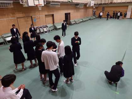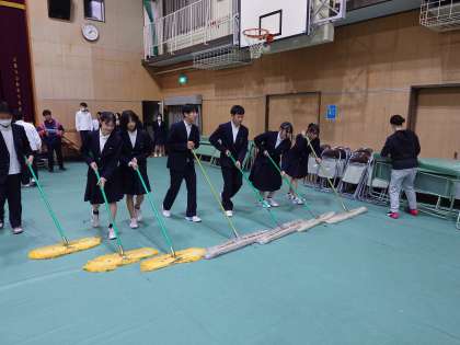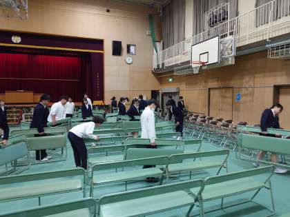 2年生の皆さんが明日の卒業式の式場準備にやってきました。6期生の先輩が気持ちよく巣立ってくださるよう、美しい式場づくりをめざします。皆さん、頑張ってくださいね。