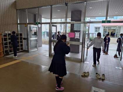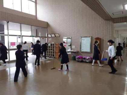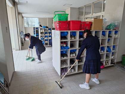式場準備は体育館内だけではありません。1年生の皆さんが.玄関や靴箱などを美しく整えています。予報では明日も晴れ模様。良い卒業式になりそうです。