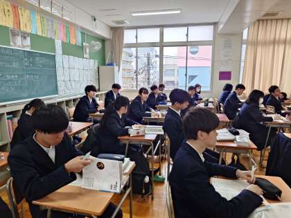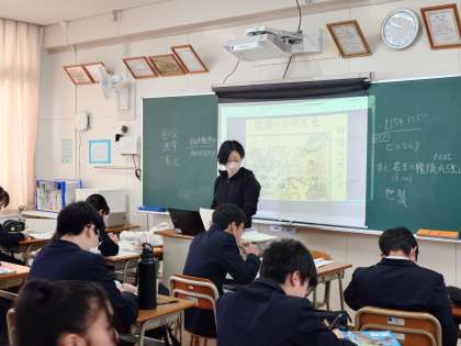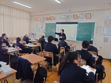 2年生社会科の授業で明治時代の政治の流れを学習しています。明治新政府は倒幕に活躍した旧薩摩・長州藩の出身者が政治を独占していました。当時の政治に不満のある人々が、国民の政治参加をめざして、国会の開設を求める運動を起こしていくことになります。スクリーンには当時の資料が映し出され、先生が流れを説明されています。資料を見るとより分かりやすくなりますね。