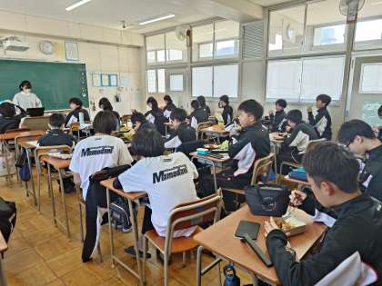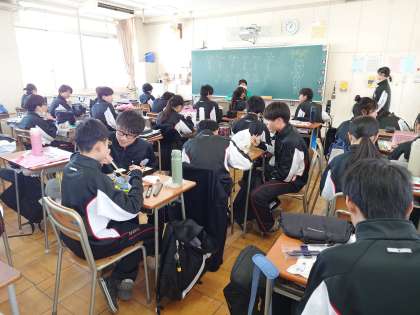 いつも給食を作ってくださる東桃谷小学校が卒業式のため、今日はお家からお昼ご飯を持ってきました。1年生の教室では、色とりどりのお弁当が広がっています。好きなおかずが入っているのでしょうか?皆さんニコニコと嬉しそうです。