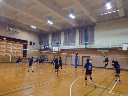 体育館では女子バレーボール部が他校のバレー部に来てもらい、練習試合を行っています。ふだんの練習の成果を試す良い機会です。収穫や課題を見つけて、今後の練習に活かせると良いですね。皆さん、頑張ってください!