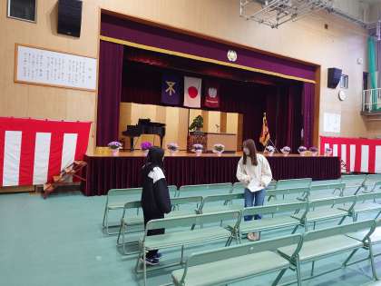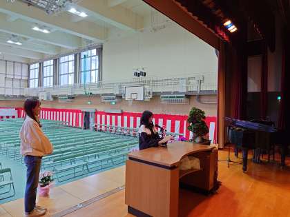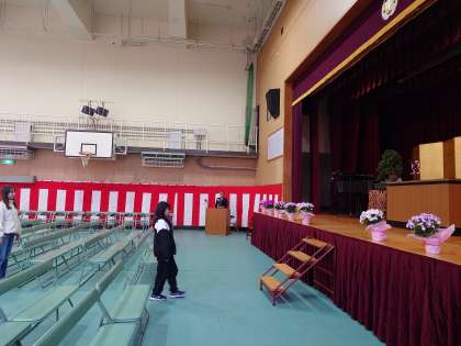 式場の準備が終わり、入学式のリハーサルが行なわれています。新入生代表のあいさつなど、式次第に沿って当日の動きを練習します。明日の本番では、元気なあいさつ(スピーチ)をよろしくお願いします!