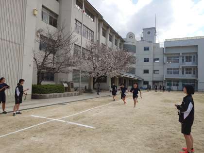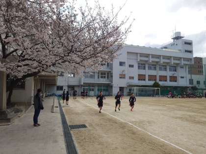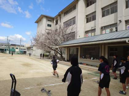 運動場では陸上部の皆さんが、スタートダッシュの練習を行っています。30m〜50mの距離を全力で走り、タイムを測ります。桜の花が咲く中を駆け抜けるのは、気持ち良さそうですね。