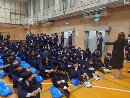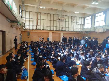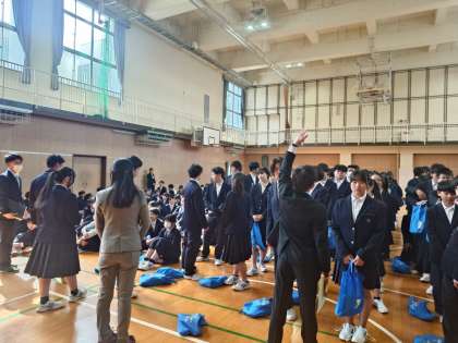 令和7年度1学期始業式を行いました。新クラスが発表され、皆さんのドキドキがおさまらない中、慣れないクラスの列に並びます。皆さん、気持ちを合わせて仲の良いクラス・学年を築いてくださいね。