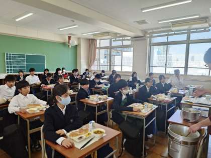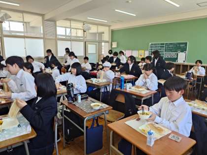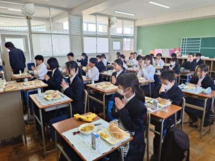 給食の配食が終わり、1年生の皆さんが給食をいただき始めました。小学校でも経験していたので、係の皆さんがてきぱきと動き、スムーズに配食ができましたね。しっかりといただいて、午後の活動も頑張りましょう。