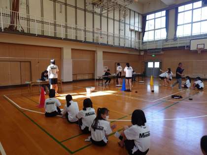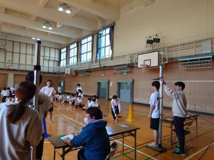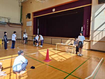 体育館で2年生の皆さんが身長・体重を測っています。年に2回実施される「発育測定」。半年前の測定と比べてどのくらい変化がありましたか?保健室にも器具があるので、関心のある人は訪ねてください。
