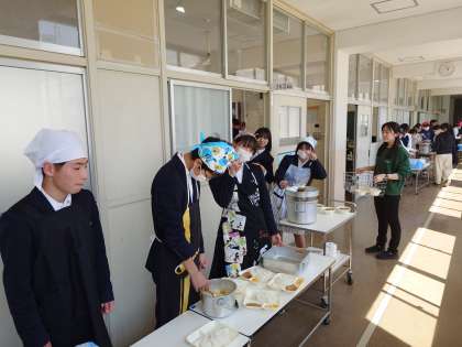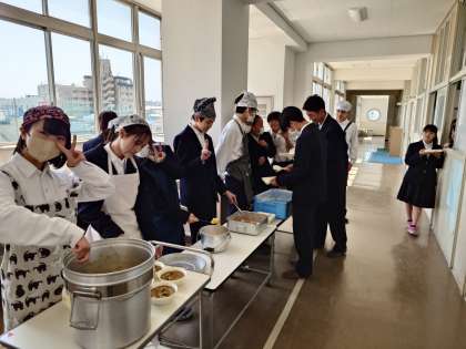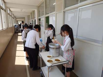 3年生の皆さんも「カツカレー」をいただきます。配食時に大盛りをリクエストする人がいるようです。給食の献立の中でもカレーライスは人気がありますね。この様子なら、各クラスともに完食しそうです。