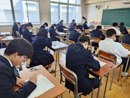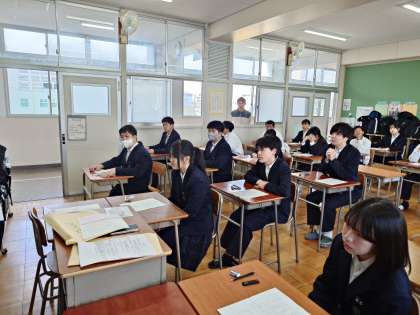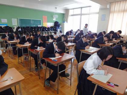 まもなく3年生対象に「全国学力・学習状況調査」が始まります。一昨日の理科に続き、今日は国語と数学のテストを行います。まずは出席番号や7桁の答案番号を記入して、テスト開始に備えます。マークシートで答える問題があるので、誤って回答しないように気をつけてくださいね。