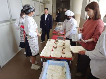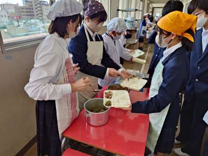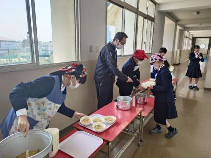午前の授業が終わり、1年生の教室前で給食の配食が始まりました。今日のメニューは「豚の生姜焼き・豆腐のお味噌汁・じゃこピーマン」。甘辛く炒めた豚の生姜焼きは白ご飯に合いますよ。明日は万博への校外学習なので給食はありません。お家からお昼ご飯(お弁当)を持ってきてくださいね。