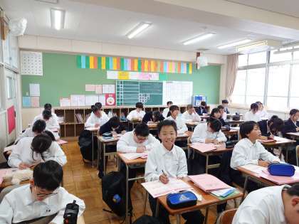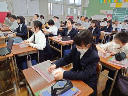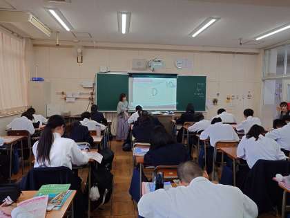 1年生英語の授業でアルファベットの書き方を練習しています。スクリーンにはAから順番に文字が映し出され、皆さんスクリーンを見ながら1文字ずつノートに書き込んでいます。一緒に発音も覚えると良いですね。帰ったら復習しましょう。