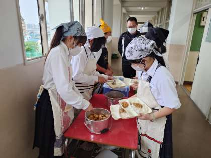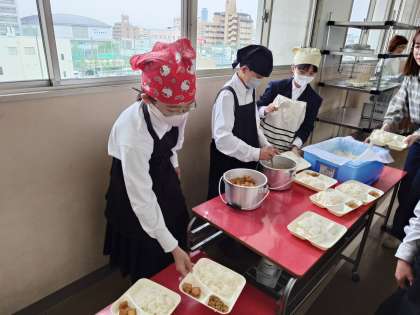 4時間目の授業が終わり、1年生の皆さんが給食の準備を行っています。今日の献立は「鶏とジャガイモの煮物・厚揚げの醤油だれ・紅サケのそぼろ」。サケの身をゴマと一緒に煎ったそぼろはご飯のお供ですね。皆さんたくさん食べてください!