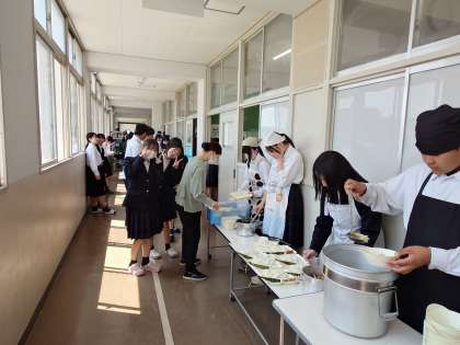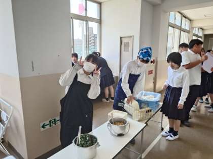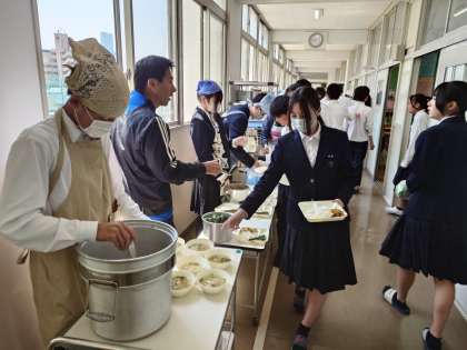 お昼休みのチャイムが鳴り、3年生の教室前で給食の準備が行なわれています。今日のメニューは「きんぴらちらし・五目汁・ちまき・抹茶大豆」。ちまきは子どもの日の行事献立。「子どもが元気に育つように」との願いが込められているそうです。笹の葉でくるまれたちまきは美味しいですよ。