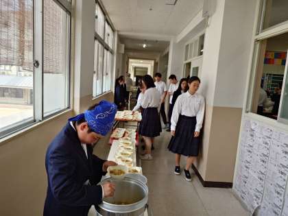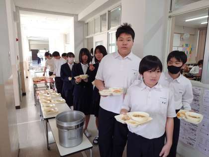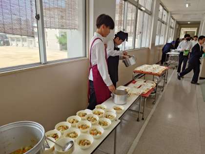 午前の授業が終わり、2年生の教室前で給食の準備が行われています。今日は「カレースープ・ピザ・ミックスフルーツ」の洋風メニュー。豚肉にジャガイモ・玉ねぎ・キャベツ・ニンジンなどのお野菜がたっぷり入ったカレースープ。よければお替りしてください。