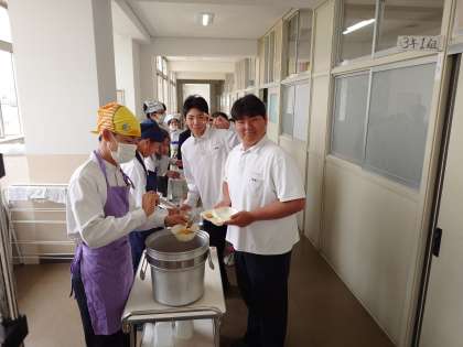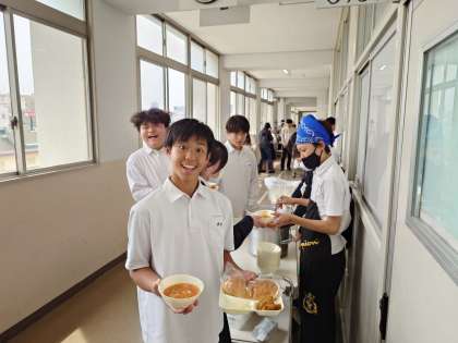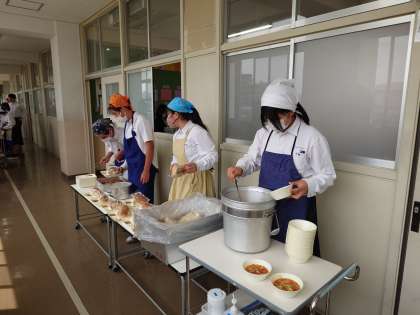 午前の授業が終わり、3年生の教室前で給食の準備が始まりました。今日は「トンカツ・ミネストローネ・梨」をいただきます。鶏肉とキャベツ・根菜をトマトで煮込んだミネストローネはイタリアの代表的なスープだそうです。皆さん、美味しくいただいてくださいね。