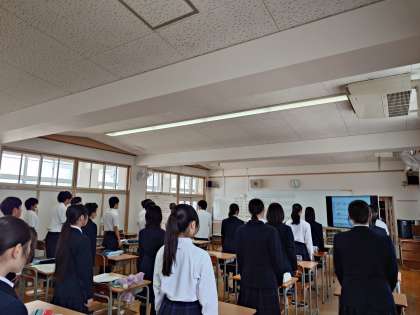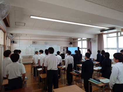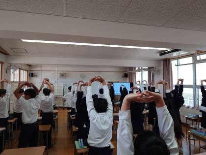 2年生の皆さんが音楽室で合唱の練習を行っています。まずは身体のストレッチから。両足を肩幅程度に広げて下半身を安定させ、上半身はリラックスした状態に保つと、合唱に適した姿勢になるそうです。皆さん、声が出しやすくなりましたか?