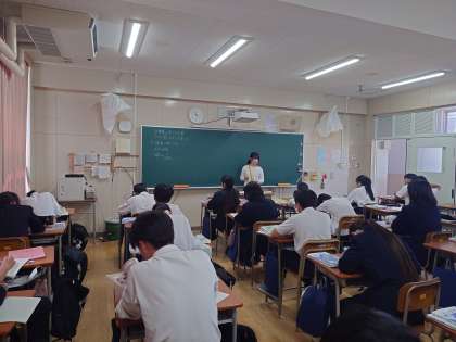 2年生数学の授業で取り組んでいるさまざまな式の計算。今日はかけ算とわり算が混じった計算方法を教わります。わり算の部分を逆数のかけ算に変えて計算すると、全てがかけ算の形になるとのこと。いろいろなパターンの問題を解いてみて、解法のコツを身につけましょう。