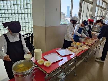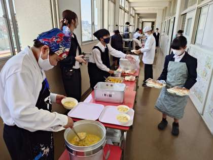 午前の授業が終わり、1年生の皆さんが給食の準備を行っています。今日のメニューは「鶏とコーンのスープ・キャベツのひじきドレッシング・河内晩柑(かわちばんかん)」。グレープフルーツに似た河内晩柑は、さっぱりした甘味が特長だそうです。皆さん、美味しくいただきましょう。