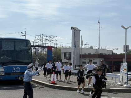 バスが「道の駅葛城」に到着しました。しばらく休憩を取る予定です。天気は快晴。皆さん、車酔いなどは大丈夫ですか?