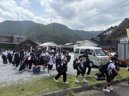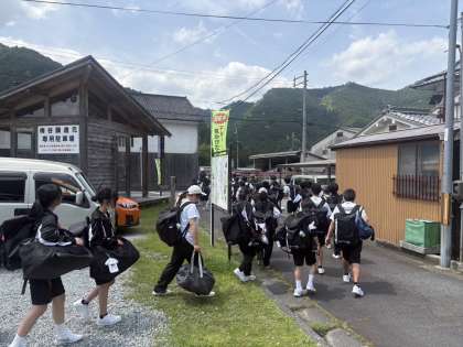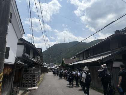 皆さん荷物を手に宿舎へと向かいます。古い家並みが連なる道を、皆さんのんびりとお散歩しています。