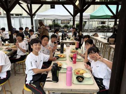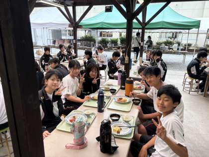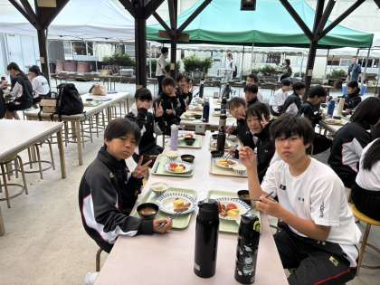 皆さん、グループ毎にテーブルを囲んで朝ご飯をいただきます。山の新鮮な空気もごちそうですね。