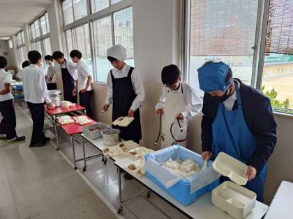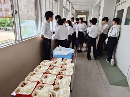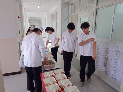 午前の授業が終わり、2年生の教室前で給食の準備が行なわれています。今日は「焼焼売・鶏と春雨のスープ・ツナとモヤシの炒め物」の中華献立。チンゲン菜や玉ねぎ・ニンジンが入った春雨スープは干しシイタケのお出汁が味を引き立てます。よければお替りしてくださいね。
