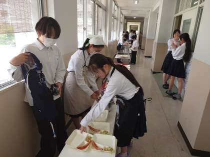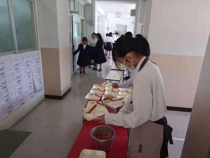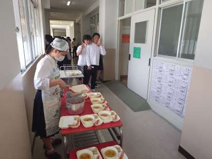 午前の授業が終わり、2年生の教室前で給食の配食が行なわれています。今日のメニューは「ウインナーのケチャップソース・鶏と野菜のスープ・焼きツナキャベツ・おさつチップス」です。ケチャップで味付けされた大きなウインナーはツナキャベツと一緒にパンにはさんで食べても美味しいですよ。