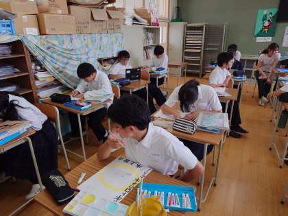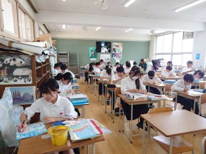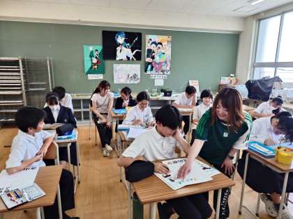 2年生の皆さんが「ダジャレ」をテーマにした絵画を制作しています。明朝体やゴシック体など好きな書体を選んで、ダジャレの文字をレタリングしている模様。線の太さや全体のバランスなど、絵を描くイメージを持つことがポイントだそうですよ。