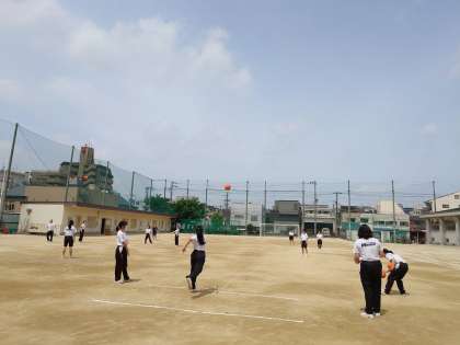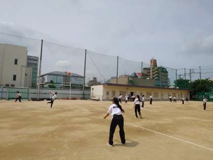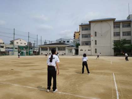 3年生女子の皆さんが運動場でハンドボールを投げあっています。これから新体力テスト「ハンドボール投げ」を測定します。女子の場合、23m以上投げると10点満点になるそうです。皆さん、自己ベスト更新をめざして頑張ってください!