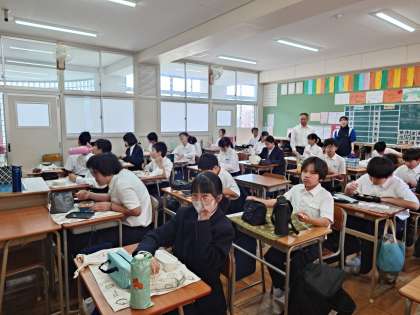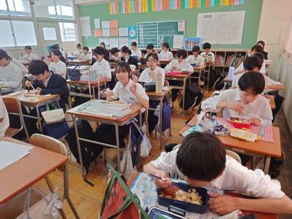 お昼休みのチャイムが鳴り、1年生の皆さんがお昼ご飯をいただいています。今日は給食を調理してくださる東桃谷小学校さんが代休のため、お家からお昼ご飯を持ってきました。好きなおかずが入っているのか、皆さんニコニコ美味しくいただいていますね。