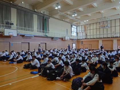 3年生の皆さんが体育館に集まってきました。これから修学旅行の事前説明会が行なわれます。まずはしおりに沿って持ち物などを確かめます。旅行2日目のラフティングでは(濡れるかもしれないので)水着が必要だそうです。皆さん準備は万全でしょうか?