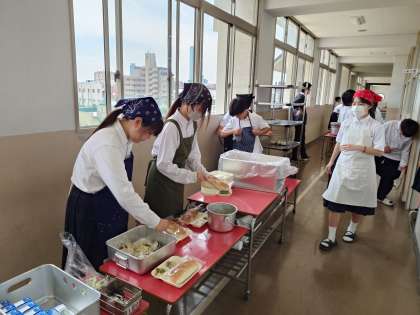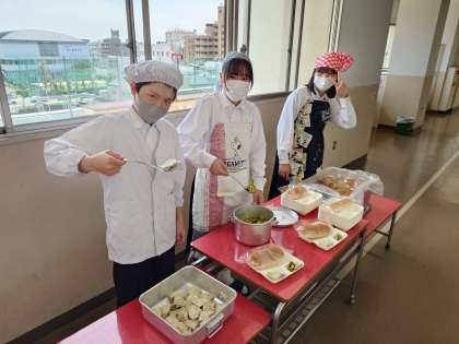 お昼休みのチャイムが鳴り、1年生の皆さんが給食の準備を行っています。今日は「カツオのガーリック焼き・押麦のスープ・アスパラガスのソテー」の洋風献立。カツオのガーリック焼きは、ガーリックに塩・コショウで味付けされており食がすすみそう。パンと一緒にいただきましょう。