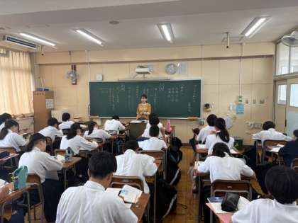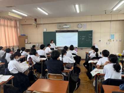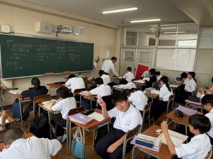 英語の授業では、新出単語の意味を確認して、前の映像にあわせて発音しています。みんな元気よく発音しています。