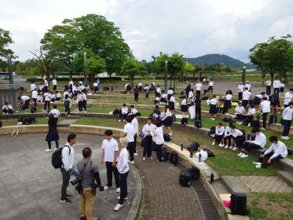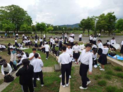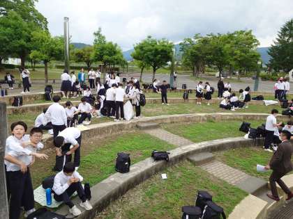 芝生広場での自由時間を過ごしています。さわやかなちょうど良い気温です。