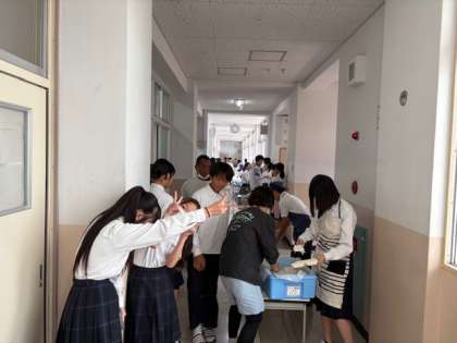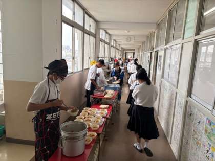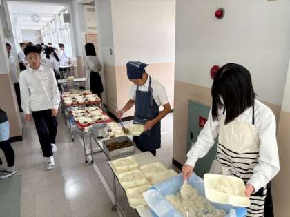 1年、2年の生徒が配膳をしています。今日は磯辺揚げ、衣に青のりを混ぜてあげています。ご飯と厚揚げと里芋の味噌煮やキャベツの赤じそあえも美味しそう。たくさん食べてくださいね。