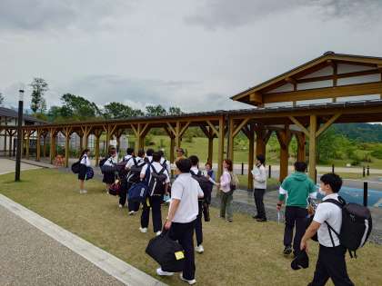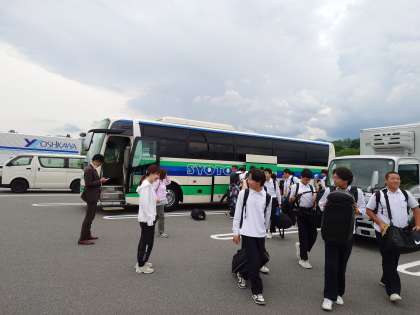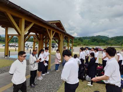 バスは天龍峡PAに到着しました。民家の方々が桃中生のお迎えに来てくださっています。民家の皆さん、今日・明日の2日間、桃中生をどうぞよろしくお願いいたします。