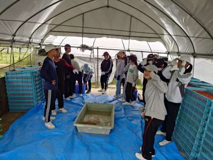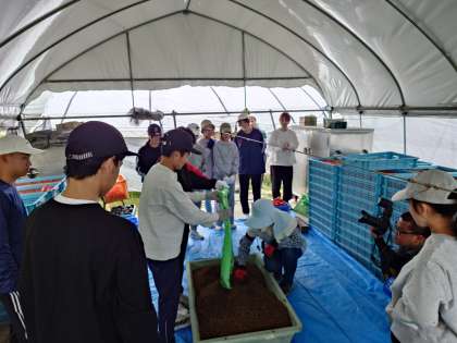 農業体験チームが作業の手順を教わります。大きなトレイに培養土を入れ、小さなポットに移し替えるようです。