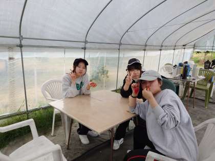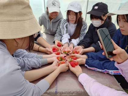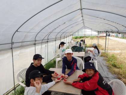 収穫したイチゴをいただきます。農作業をお手伝いしたので、味も格別でしょう。得難い体験になりましたね。