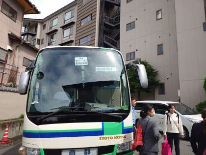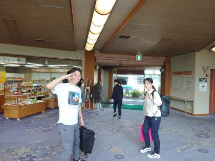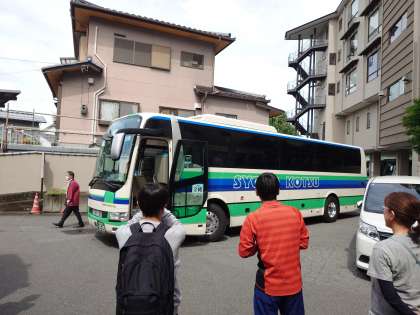 飯田市周辺の各村で民泊体験中の桃中生をお迎えにバスが次々と出発していきます。バスはお昼前に本日のお宿に戻り、みんなでお昼ご飯をいただきます。