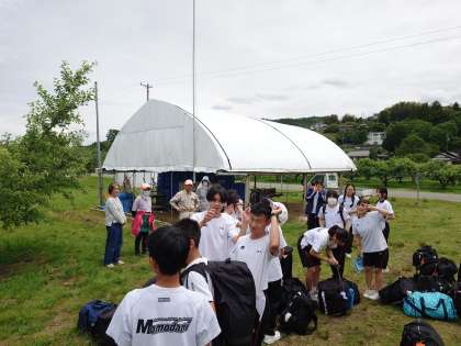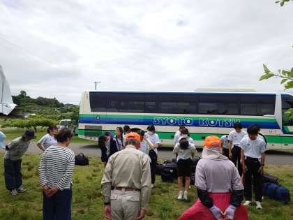 今田平に迎えのバスが到着しました。これから離村式が行なわれます。一晩お世話になった民家の方々に心を込めてみんなでごあいさつ。「民家の皆さん、ありがとうございました!」