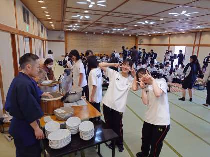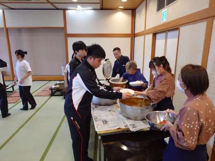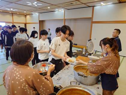 お昼ご飯の献立は「カレーライス」。しっかりいただいて、午後の自然体験「天龍川ラフティング」に備えましょう。