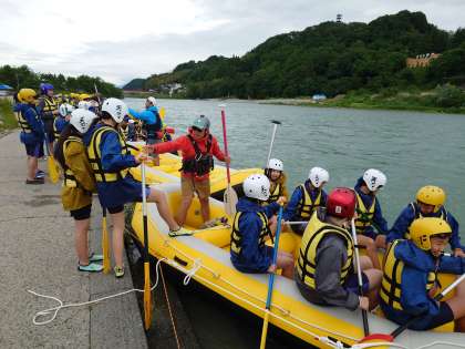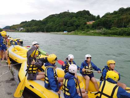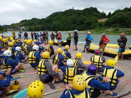 いよいよクラス毎にボートに乗り込みます。今日の天龍川はラフティングにちょうど良い水量だそうです。