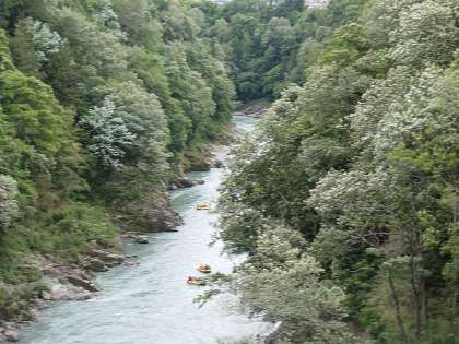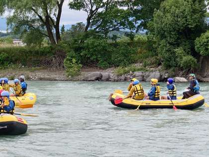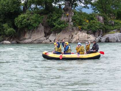 皆さん声を合わせてパドルを漕いでいます。川の流れを上手くよみながら、急流を乗り切りましょう。